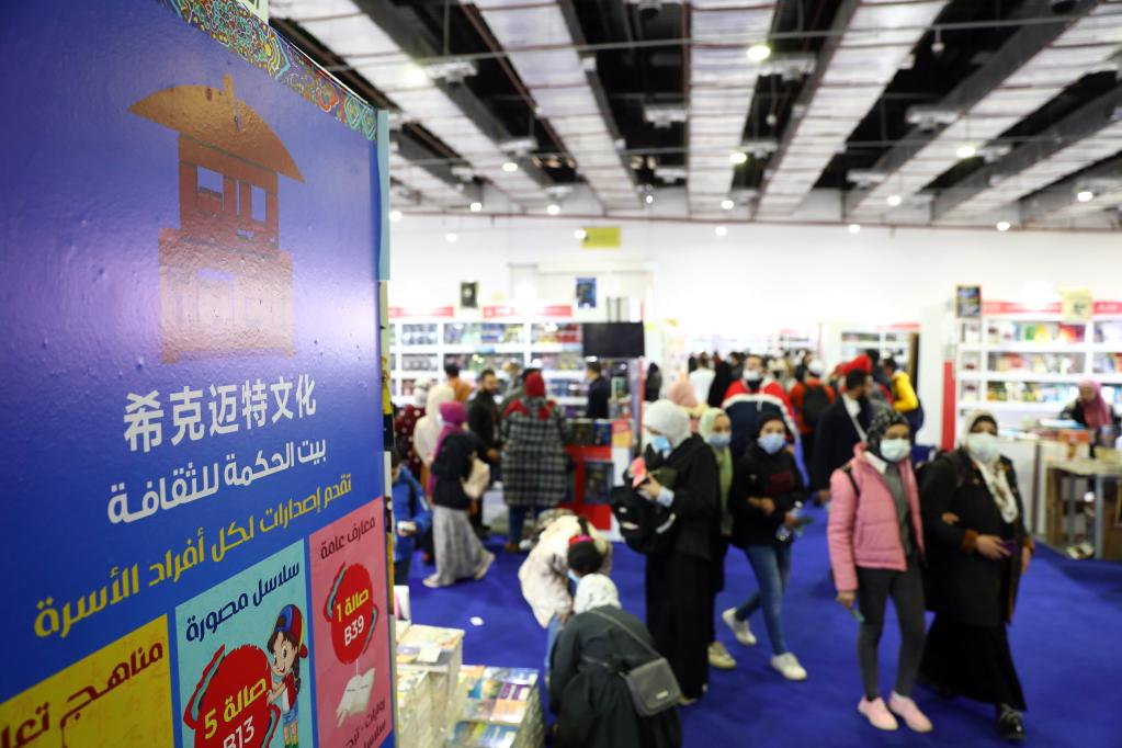 2月4日,在埃及開羅舉辦的開羅國際書展上,人們走過中國圖書展位。新華社發(fā)(艾哈邁德·戈馬攝)