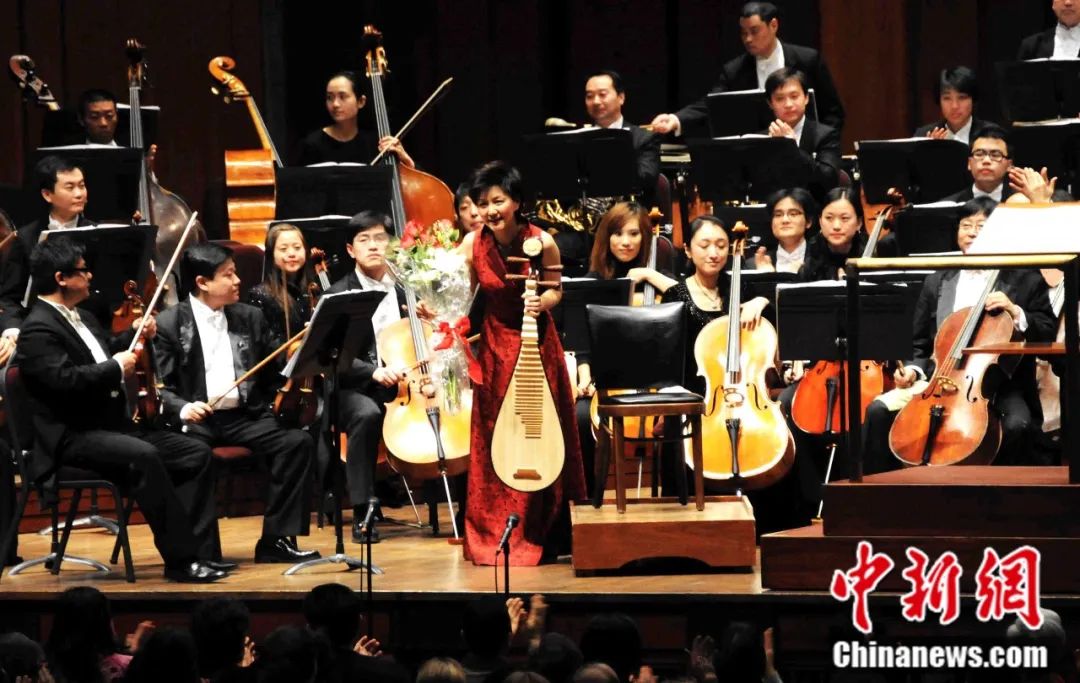 2009年2月,“琵琶皇后”美譽(yù)的章紅艷在美國肯尼迪藝術(shù)中心演奏《琵琶協(xié)奏曲》后謝幕。中新社記者 邱江波 攝