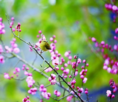 湖南省龍山縣,花兒開放,引來小鳥“鬧春戲花”。新華社發(fā)