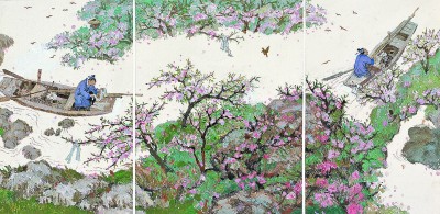 “芳草鮮美,落英繽紛。漁人甚異之,復前行,欲窮其林。”蔡皋輕聲道,“異”就是驚奇,正因有了好奇,才讓漁人鼓足勇氣,探尋奇境。“我傾注筆墨,來描繪漁人發(fā)現(xiàn)桃花源的整個過程。”