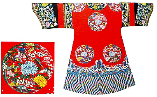 故宮藏大紅緙絲彩繪八團(tuán)梅蘭竹菊紋夾袍及紋樣 選自《遇見(jiàn)中國(guó)服飾藝術(shù)》