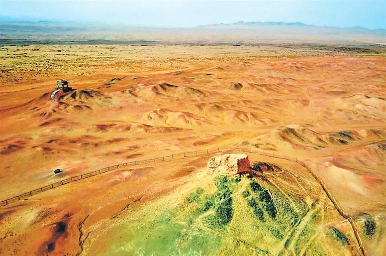 “勸君更盡一杯酒,西出陽關無故人。”王維擔心,友人過了陽關,就進入另一片天地,在那里,連折柳送友都很難辦到。陽關,離玉門關不遠,在古人看來,這里也是春風不度之地,然而,陽關在歷史上是繁華過的,曾經車水馬龍,著名的陽關大道至今留有往日喧騰的車轍。周而復的小說《上海的早晨》里有一句話“你走你的陽關道,我走我的獨木橋”,后來成為百姓口頭俗語,可見“陽關大道”之盛名。我們去陽關走訪的那一天,風和日麗,長空中有幾片白云在飄。一只金色的蒼鷹在孤獨地盤旋。而那聳立的陽關烽燧,仍站在沙海里,守護著這座關隘,令人動容。