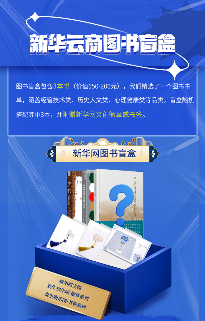 本次活動由新華云商聯(lián)合機械工業(yè)出版社、中國科學(xué)技術(shù)出版社、光塵文化、湛廬文化共同推出。盲盒內(nèi)圖書涵蓋經(jīng)管技術(shù)類、歷史人文類、心理健康類等品類,將隨機搭配三本,可能與您的藏書重復(fù),或不符合您的閱讀愛好,請您慎重選擇理性購買。同時,盲盒內(nèi)會附贈新華網(wǎng)文創(chuàng)徽章或書簽。