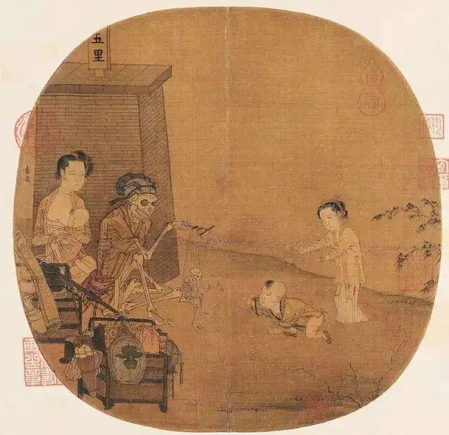 在這幅團(tuán)扇大小的畫面中,李嵩描繪了一幅傀儡戲的演出場景,一幅披衣戴帽的大骷髏,操縱著線板,指揮著一幅小骷髏在表演各種動(dòng)作。一個(gè)嬰兒好奇地爬向那個(gè)表演中的骷髏小傀儡……活人與骷髏、生與死,同時(shí)出現(xiàn)于畫面中,在中國古畫里是極罕有的,也因此引起了后世的種種猜測解讀。