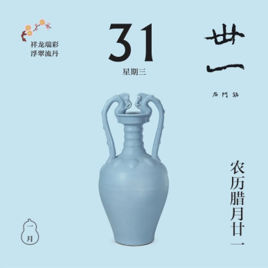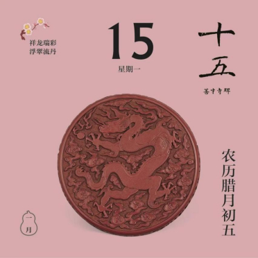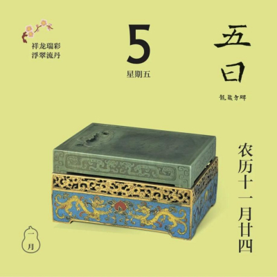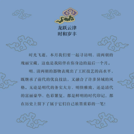 翻開(kāi)1月月份頁(yè),首先跳入眼簾的,是主題詞“祥龍瑞彩”。這個(gè)月以絢麗的顏色為主線,串起各色龍文物,比如精致的宋代單色釉龍紋盤,絢麗的故宮官式建筑和璽彩畫,還有優(yōu)雅的清代掐絲琺瑯游龍花卉紋瓜式蓋罐……