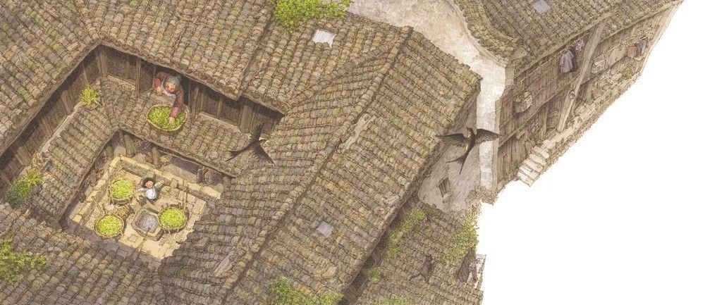 整個繪本主要采用寫實性的現(xiàn)實主義風格,繪畫者付出極大的耐心和精力,用鋼筆和馬克筆細致描繪每一片磚瓦、每一塊石板、每一叢花葉、每一扇門窗,甚至每一條木紋、每一絲波紋、每一道皺紋……力求真實地呈現(xiàn)物像的肌理和質(zhì)感,讓人身臨其境。同時,也加以寫意的手法,用柔和的淡彩渲染懷舊的色調(diào)和溫馨的氛圍。尤其值得稱道的是,在多幅畫面中,以丫丫等待的“神秘的客人”——燕子為一種符號角色,無論之于畫面還是主旨,都有其獨到的意義。燕子飛翔于水面和屋宇之上,給靜態(tài)的環(huán)境帶來靈動之感,有時還能平衡畫面的結(jié)構(gòu)。燕子是江南春天的使者,也是童年喜愛的精靈。蘇軾和歐陽修各自的《蝶戀花》詞中都寫到了燕子,前者是:“花褪殘紅青杏小。燕子飛時,綠水人家繞。”后者是:“畫閣歸來春又晚。燕子雙飛,柳軟桃花淺。”這一古典意象在繪本畫面中的反復出現(xiàn),羽翼間展開了江南的典雅、清麗以及輕愁。作品里的另一種動物是時常縈繞主人腳邊的貓咪,增添了祥和的家居趣味,也代表一種熟稔的情感皈依。原本黑瓦白墻的江南民居在畫面中作為背景或前景,灰中帶彩、冷中帶暖,既體現(xiàn)了時間的流逝,也象征著永恒的家園。外公背著丫丫雨夜歸家的場景以多個連貫畫面變換角度來鋪展,暗夜中始終有溫暖的燈光照亮回家的路,也有堅實的后背托舉稚嫩的夢,給孩子以安全、安穩(wěn)和安心。