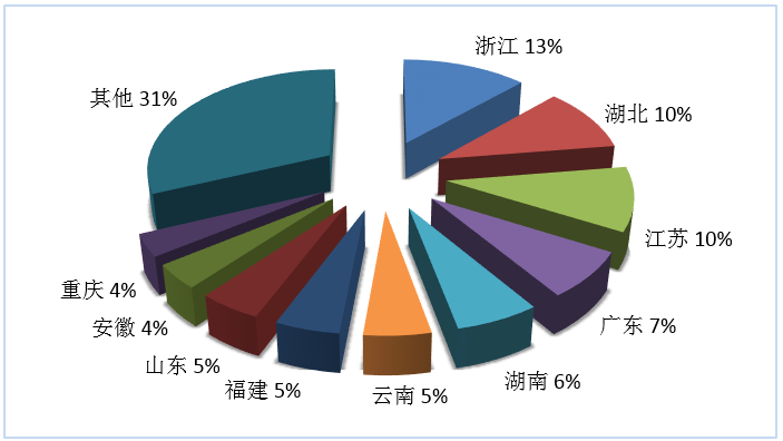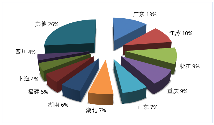 第三季度旅行社國內(nèi)旅游接待人次排名前十位的地區(qū)由高到低依次為浙江、湖北、江蘇、廣東、湖南、云南、福建、山東、安徽、重慶(見圖4)。