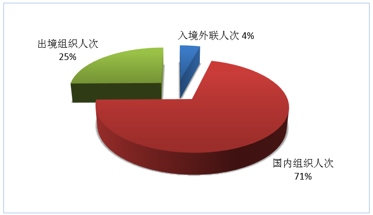 按照入境外聯(lián)人次、國內(nèi)組織人次、出境組織人次三項指標(biāo),入境旅游、國內(nèi)旅游、出境旅游市場人次所占份額依次為4%、71%和25%(見圖6)。