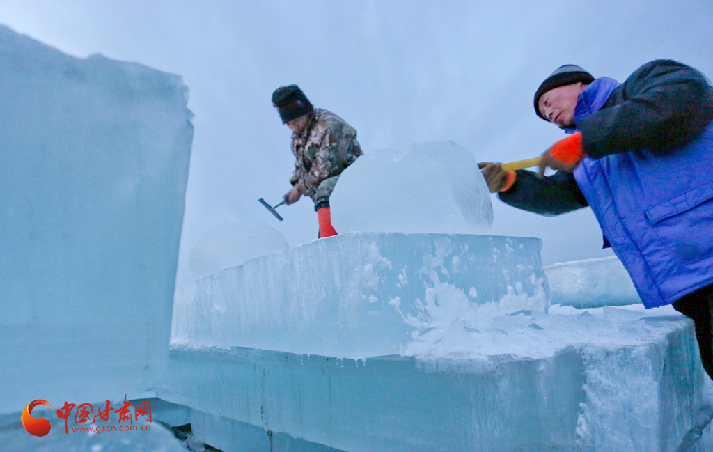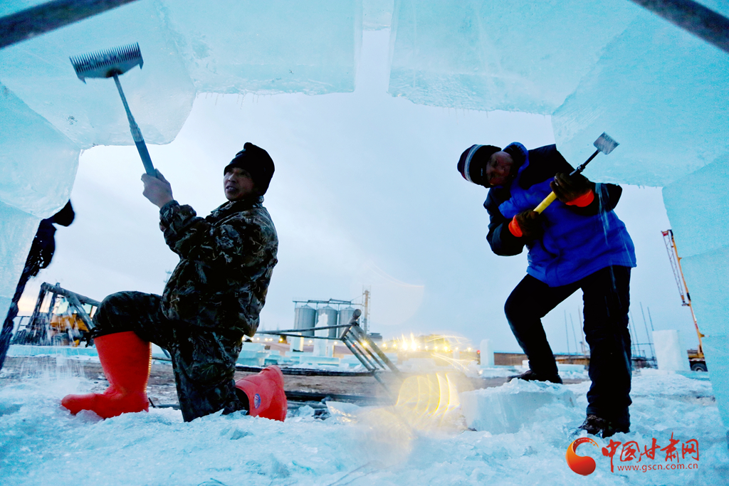 1月11日傍晚,張掖市甘州區(qū)屋蘭古鎮(zhèn)九曲黃河燈陣景區(qū)冰雕工藝師們正在加班加點(diǎn)趕制大型冰雕。