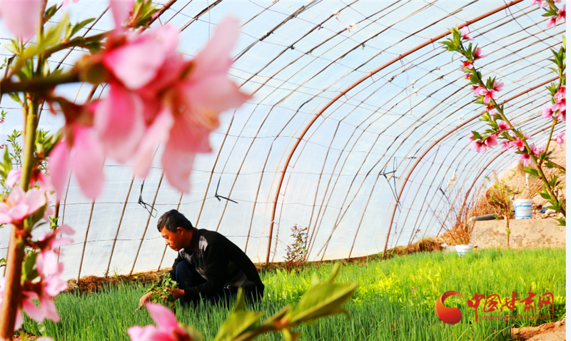 走進(jìn)敦煌市月牙泉鎮(zhèn)現(xiàn)代采摘園區(qū)農(nóng)民陶寶憲的溫室大棚,粉紅的桃花開(kāi)得正艷,濃濃春意撲面而來(lái),在花香的陪伴下,陶寶憲在大棚中辛勤勞作。