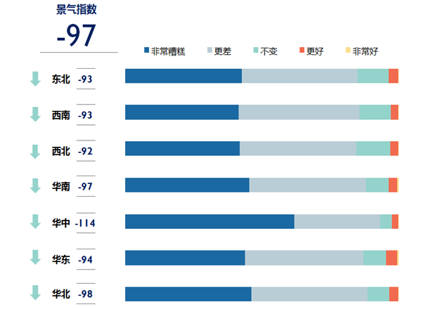 《報(bào)告》稱,受疫情影響,全國各地對(duì)于旅游到訪目的地的景氣預(yù)期同樣極度消極,7大地區(qū)市場(chǎng)的平均景氣指數(shù)跌至-97。其中,受疫情影響最為嚴(yán)重的華中地區(qū)景氣指數(shù)最低。同樣的,目的地景氣指數(shù)也表現(xiàn)出疫情影響越嚴(yán)重,指數(shù)表現(xiàn)越低的趨勢(shì)。