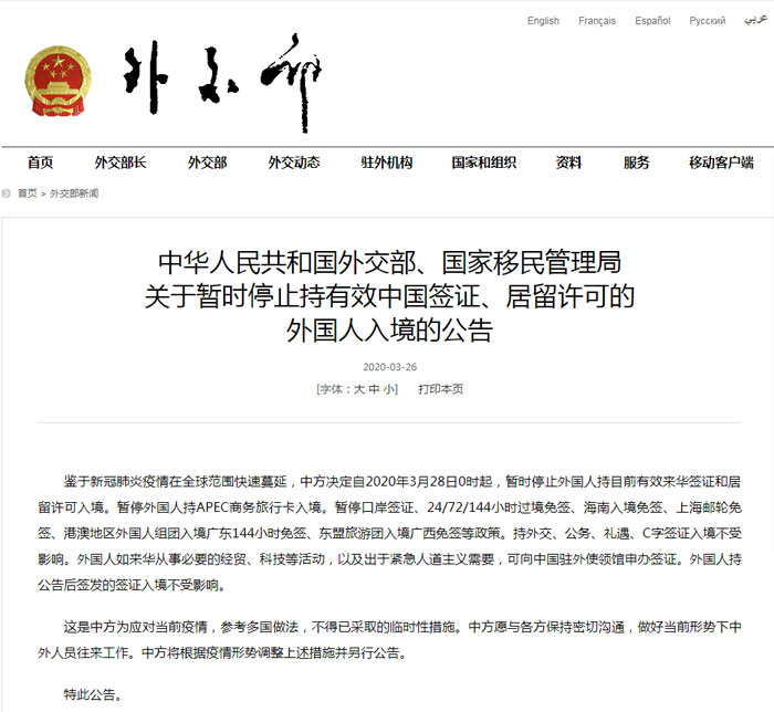 3月26日,中華人民共和國外交部、國家移民管理局發(fā)布《關于暫時停止持有效中國簽證、居留許可的外國人入境的公告》(以下簡稱《公告》),決定28日起,暫時停止外國人持目前有效來華簽證和居留許可入境。