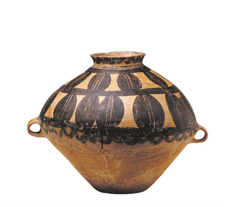 馬家窯文化半山類型(距今約 4500 年),廣河縣地巴坪出土。這是雙耳甕器型大氣貴重,施以紅、黑二彩,紅、黑彩交替使用,腹部繪多層連續(xù)垂弧紋和鋸齒紋,黑、紅彩交替使用,由三組分層連續(xù)的垂弧紋組成整體圖案,每層由兩層黑色帶紋和一層紅色帶紋組成,黑色帶紋上緣繪向上的鋸齒紋。整個圖案密集繁復(fù),俯視猶如一朵盛開的鮮花,造型豐滿,色彩鮮艷。
