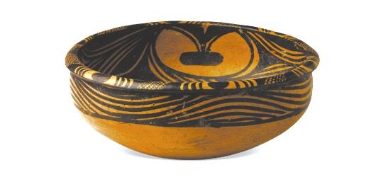 馬家窯文化馬家窯類型(距今約4800年),1966年蘭州市王保保城出土。這是一只工藝精湛,保存完好的彩陶盆,這只旋紋彩陶盆最大的特點是盆內(nèi)壁上繪的三組變體人面紋,同學(xué)們看出這組圖像人面嗎?看懂人面紋需要發(fā)揮想象力,總之,我們的先祖抽象表達的能力及想象力真令今人景仰!