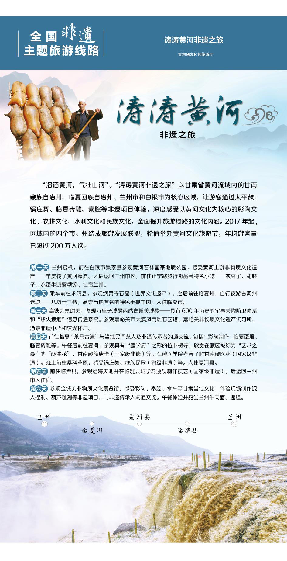 中國(guó)社科院財(cái)經(jīng)學(xué)院旅游研究室主任戴學(xué)峰對(duì)我省入選的兩條線路這樣點(diǎn)評(píng):“交響絲路非遺之旅”涉及敦煌(酒泉)、嘉峪關(guān)、金昌、張掖、武威、蘭州等絲綢之路上最為重要的節(jié)點(diǎn),其文化含量不容置疑,而且非遺傳承人云集、傳承活動(dòng)豐富多彩,生產(chǎn)性傳承和活態(tài)傳承歷歷如新。這條線路開發(fā)運(yùn)營(yíng)多年,中外市場(chǎng)認(rèn)可度較高,市場(chǎng)前景優(yōu)良,是一條非常成熟的非遺旅游線路;黃河是中華民族的母親河,是華夏文明的搖籃。黃河流域非物質(zhì)文化遺產(chǎn)的保護(hù)傳承和創(chuàng)新弘揚(yáng)是黃河文化的重要支撐。“濤濤黃河非遺之旅”位于“黃河源頭”的核心片區(qū),該線路全程通過“經(jīng)典旅游線路+非遺項(xiàng)目”的融合體驗(yàn),可讓游客在旅游的同時(shí),感受甘肅黃河流域燦爛的非遺文化,全面提升旅游線路的文化內(nèi)涵。