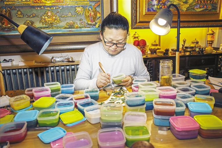 據(jù)李海明介紹,近年來(lái),經(jīng)常會(huì)受邀代表甘肅省文創(chuàng)去省外參展,而每次展出的琺瑯文創(chuàng)產(chǎn)品都會(huì)受到來(lái)自各地的年輕人的好評(píng)。“有時(shí)會(huì)把不同人創(chuàng)作的壁畫(huà)、唐卡等擺在一起展出,總有很多年輕人在我的作品前逗留良久,這說(shuō)明他們對(duì)我的琺瑯釉色彩是非常認(rèn)可的。”
