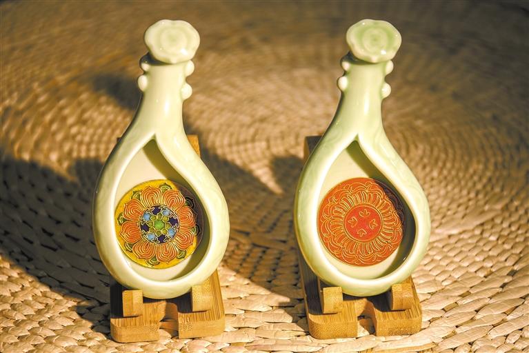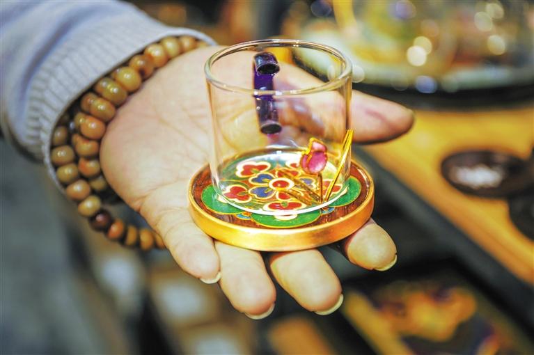 在李海明琺瑯?biāo)囆g(shù)館,記者看到工藝師們正在專(zhuān)注地進(jìn)行藝術(shù)創(chuàng)作。在展示架上,飛天琺瑯釉擺件、戲曲人物擺件、琺瑯墨匙、琺瑯茶墊等小文創(chuàng)作品令人目不暇接,就連手機(jī)殼、小鏡子這些小物件也因與琺瑯的融合變得新穎而獨(dú)特。