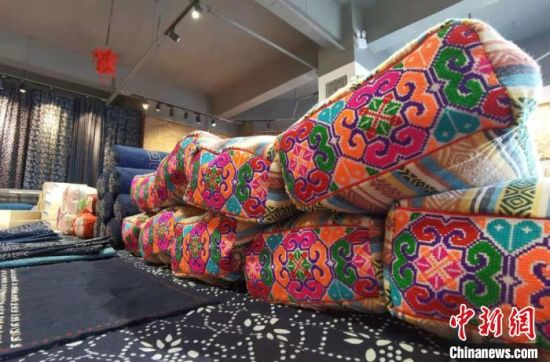 近日,中新網(wǎng)記者在安定區(qū)一家非遺工坊內(nèi)見到祁輝,她身著正紅色漢服,腰間掛著香囊,穿梭于服飾區(qū)、布偶區(qū)和染布區(qū)之間。記者看到,工坊內(nèi)展出商品種類多樣,色彩豐富,包括潮流挎包、時(shí)尚發(fā)卡、卡通布偶、可愛抱枕,以及扎染服裝和圍巾等,在極具古風(fēng)創(chuàng)意的同時(shí),還不乏國潮設(shè)計(jì)理念。