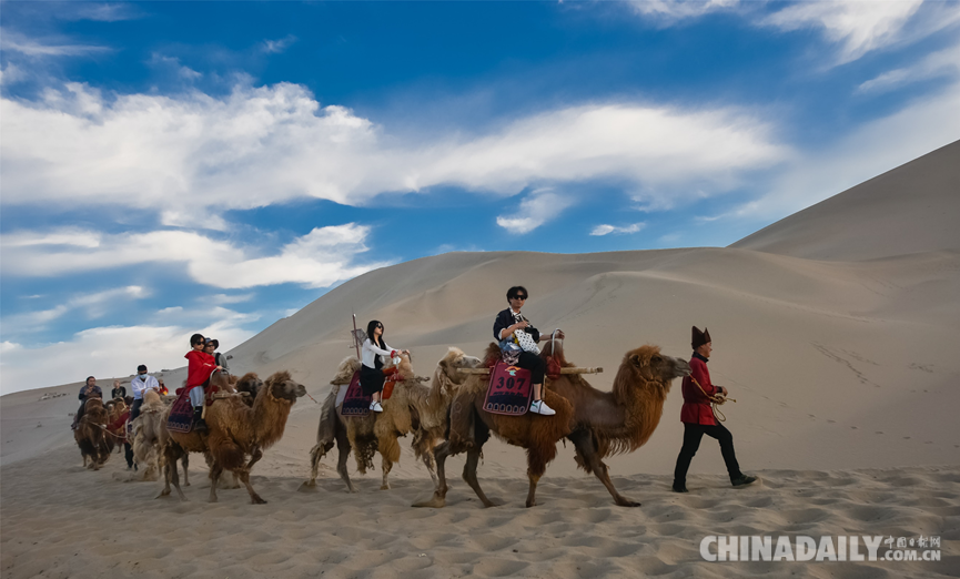 近日,來絲綢之路國際文化旅游名城甘肅敦煌游玩的游客,在騎駱駝暢游鳴沙山的過程中,驚異地發(fā)現(xiàn),這里牽駱駝的駝戶穿上了一種古裝戲中才有的“胡服”,戴一頂高高的帶有帽檐的駝色帽子,頓感大漠旅行情趣倍增,絲路風情更加濃郁。
