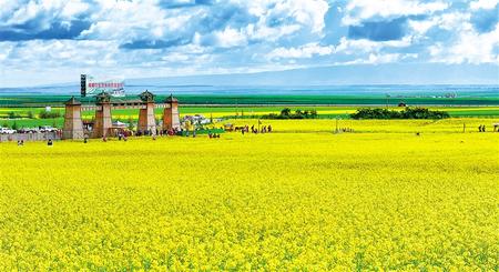 沿著國道227行走,放眼望去,遠處祁連山脈高峰聳立,近處起伏的山丘高低錯落,山間綠草如茵,色彩斑斕的野花星星點點播撒在綠草之中。山坡上點綴的牛羊安靜地吃草,呈現(xiàn)出一派安靜祥和的田野風(fēng)光。最耀眼的當屬這里的油菜花,處處可見金黃一片,成為七月河西走廊一道亮麗的風(fēng)景。