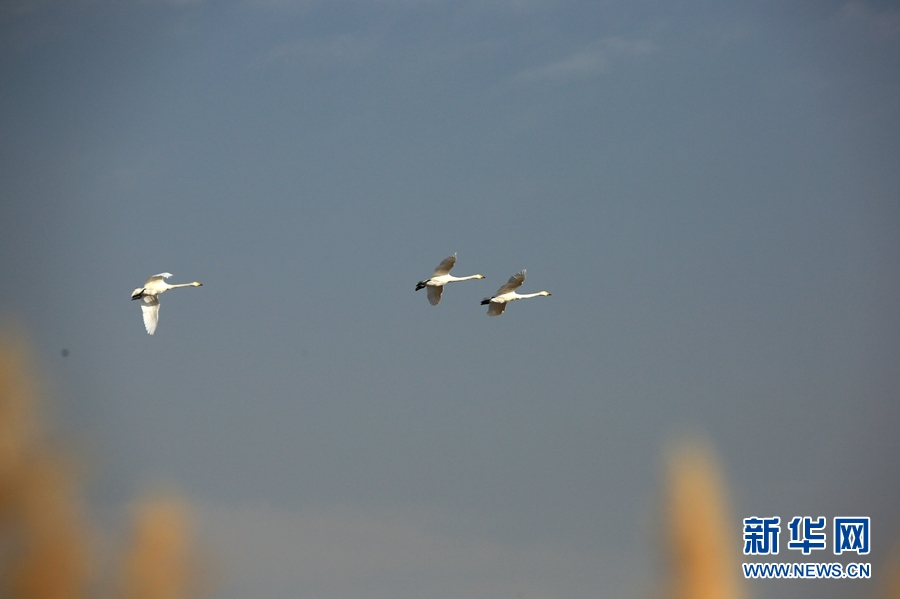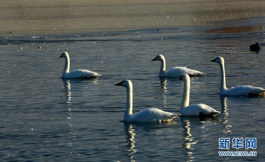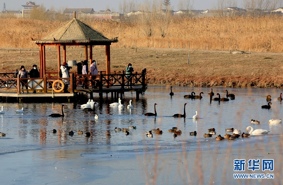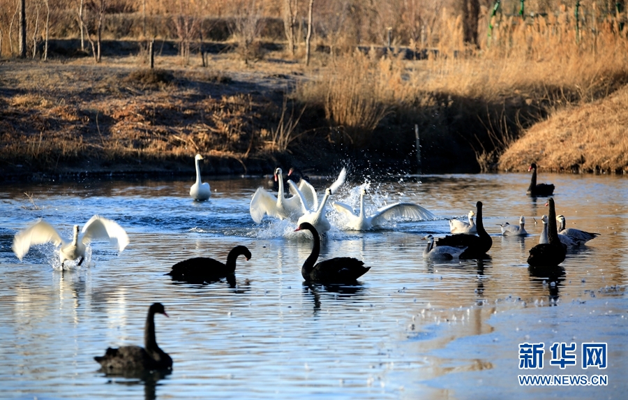 冬日清晨的甘肅省張掖國家濕地公園里碧波蕩漾,成群的白天鵝、黑天鵝等鳥類聚在一起游弋嬉戲,歡騰跳躍,成為一道亮麗的風(fēng)景線,吸引眾多游客觀賞拍照。新華網(wǎng)發(fā)(陳禮 攝)