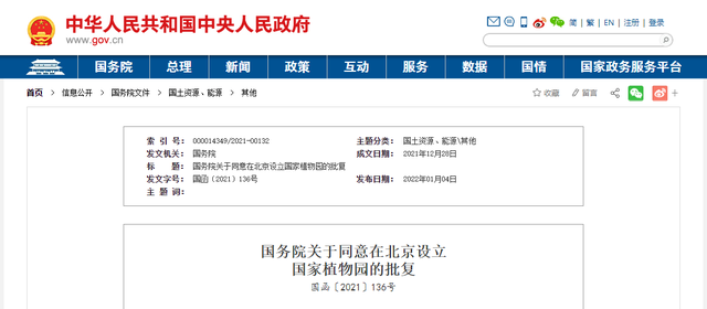 2021年12月28日,國務(wù)院公開發(fā)布《關(guān)于同意在北京設(shè)立國家植物園的批復(fù)》(以下簡稱《批復(fù)》)。《批復(fù)》稱,國務(wù)院已同意在北京設(shè)立國家植物園,由國家林草局、住房城鄉(xiāng)建設(shè)部、中科院、北京市人民政府合作共建。