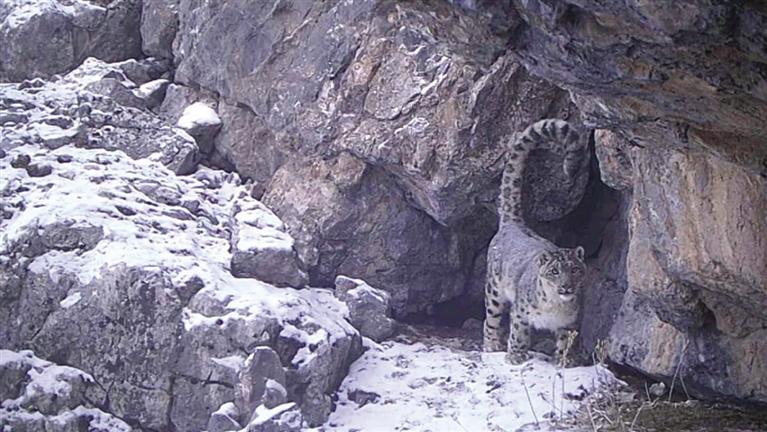 視頻中,這只雪豹巡視著自己的領(lǐng)地,并在鏡頭前留下了自己的氣味標(biāo)記。據(jù)陸橋生態(tài)中心雪豹研究團(tuán)隊(duì)李祎斌判斷,這是一只雄性成年雪豹。