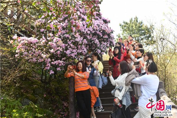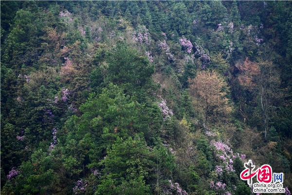 春天的穿巖山國家森林公園,漫山花開,層林盡染春色。這時(shí)候的野櫻花、野杜鵑、野映山紅竟相綻放,條條游步道宛如一條條花帶,帶著生機(jī)勃勃和滿天飄舞的芳香,讓游人心曠神怡。走在一條條蜿蜒的棧道,鮮氧環(huán)伺,鼻息間盡是春風(fēng)吹來的清新氣息。這里人文歷史與自然美景交融,既可在蜿蜒的茶馬古道,重走紅軍路,感受偉大的革命精神,又可在越河而建、凌空百丈的5D玻璃橋體驗(yàn)漫步云端的驚險(xiǎn)刺激,還可在寧靜愜意的云端古村落,感受淳樸的民風(fēng)和歷史悠長的農(nóng)耕文化奇葩。早晨的日出云海,中午的藍(lán)圖白云,下午的燦爛夕陽,鮮花與藍(lán)天、彩霞相映,讓人流連忘返。漫山遍野的綠意間,成團(tuán)櫻花、杜鵑、映山紅等夾雜其中,或粉紅或雪白,或紫色或丹紅,密密匝匝開滿枝頭。由于雪峰山景區(qū)的落差較高,從300米到1500米,櫻花期、杜鵑花期、映山紅花期交錯(cuò),成梯級往山背梯田景區(qū)、虎形山大花瑤綻放開來,讓賞花期能長達(dá)2、3個(gè)月之久。