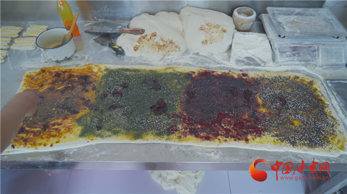 記者走進榆中縣金崖鎮(zhèn)浩燕饅頭店,一股濃濃的胡麻油、玫瑰醬、香豆等混合的香氣撲面而來,李浩燕正在忙碌地趕制一批榆中傳統(tǒng)手工月餅。案板上除了發(fā)好的面團,還擺上了炒胡麻碎、姜黃、白砂糖等豐富的佐料。只見李浩燕從揉面開始,然后鋪餡、搟制、卷面、切分、披花,一道道工序一氣呵成。經(jīng)過一個多小時,新鮮美味的月餅出爐了,切開后,內(nèi)里豐富,色彩斑斕,咬上一口軟糯可口,回味留香。