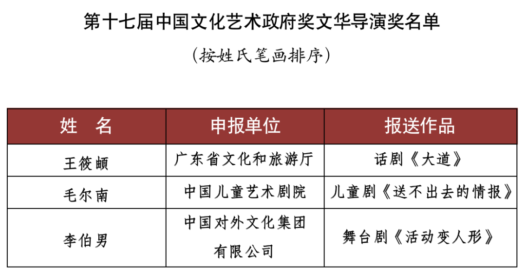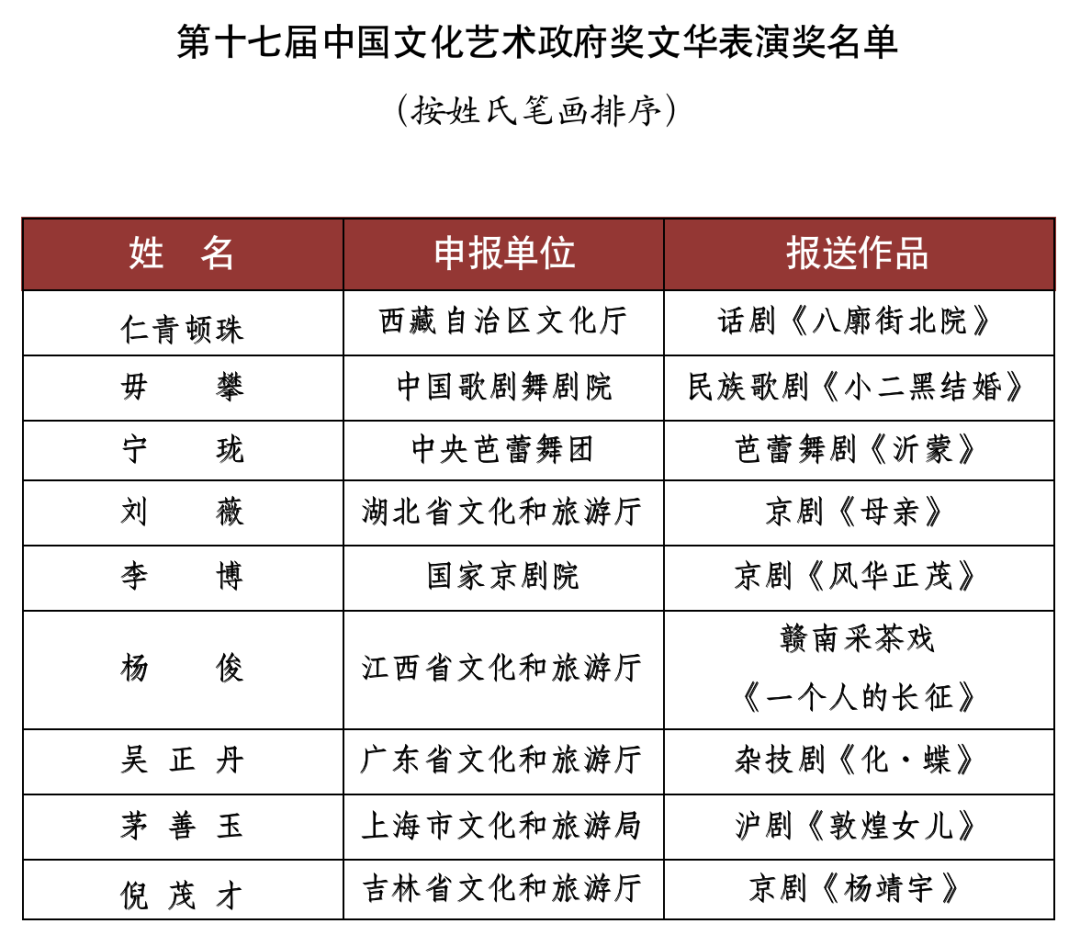 9月15日,文化和旅游部對外公布了《第十七屆文華獎獲獎名單》。舞劇《五星出東方》(北京市文化和旅游局選送)、話劇《塞罕長歌》(河北省文化和旅游廳選送)、舞蹈詩劇《只此青綠》--舞繪《千里江山圖》(中國東方演藝集團(tuán)有限公司選送)等15個作品獲得第十七屆中國文化藝術(shù)政府獎文華大獎。