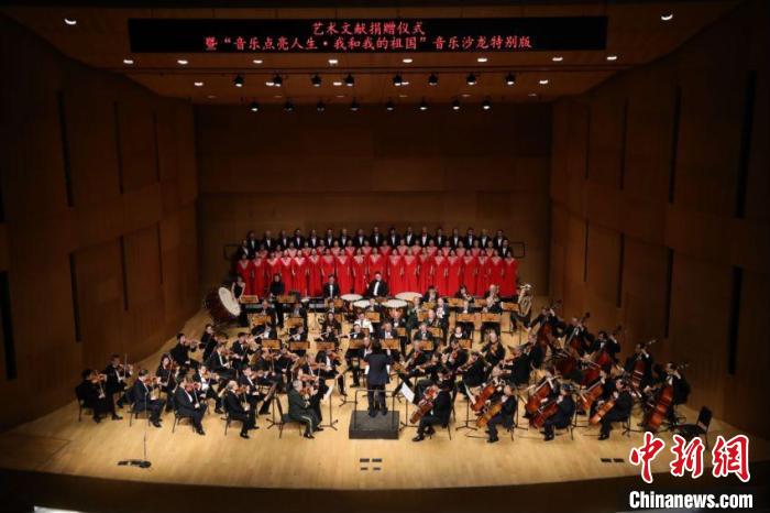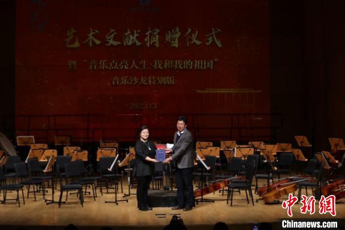 國家圖書館重要藝術(shù)文獻(xiàn)捐贈儀式暨“音樂點亮人生·我和我的祖國——音樂沙龍?zhí)貏e版”活動3日晚在國圖藝術(shù)中心·音樂廳舉辦。國家圖書館黨委書記、副館長魏大威接受捐贈,并為捐贈人代表中央民族歌舞團(tuán)民樂團(tuán)團(tuán)長馬蘭花頒發(fā)捐贈證書。