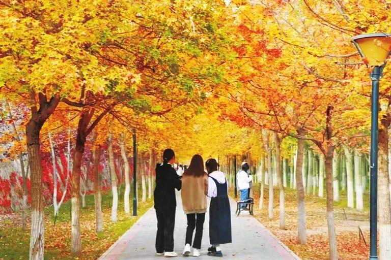 微風(fēng)輕拂,嬌黃的樹葉紛紛飄落,陽光透過葉片滲出幾分清朗,這是專屬秋的浪漫。隨便鋪開畫紙,蘸取一點(diǎn)點(diǎn)秋色,藍(lán)天、紅墻、金葉……都是最美的色調(diào)。古樸靜雅的校園彌漫著秋思,斑駁的陽光灑在圖書館的墻上,在濃濃的書卷氣中把農(nóng)歷十月寫進(jìn)秋的詩行,有思念、有沉淀、有墨香……蘭州“醉”美的大學(xué)校園,每一片落葉都是美的化身,綿延了時光,溫情了步履……
