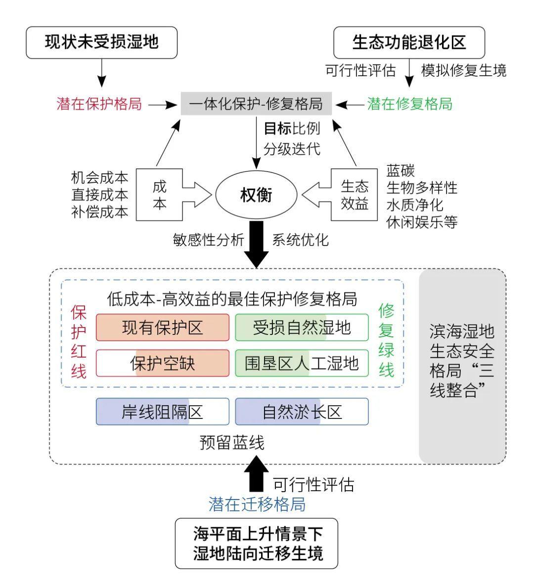 其概念構(gòu)架強調(diào)一體化整合保護與修復格局,同時兼顧濱海濕地應對海平面上升的長期適應性,構(gòu)建對濱海生態(tài)系統(tǒng)整體功能提升最惠益的生態(tài)安全格局,包括:近期搶救性生態(tài)保護紅線區(qū)與提升性生態(tài)修復綠線區(qū),以及遠期限制性生態(tài)預留藍線區(qū),由此構(gòu)建應對圍墾開發(fā)和適應未來海平面上升情形下,基于“三線整合”的濱海濕地生態(tài)安全格局(圖1)。
