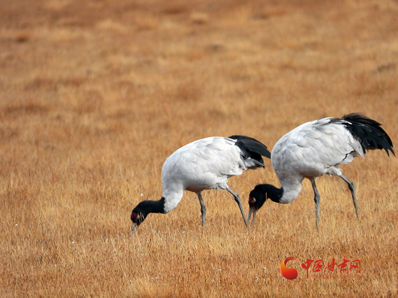 中國甘肅網(wǎng)10月17日訊 (西北角·中國甘肅網(wǎng)記者 張慧雅)近日,甘肅祁連山國家級自然保護區(qū)工作人員在轄區(qū)巡護時偶遇國家一級保護野生動物黑頸鶴歇息覓食的場景,兩只黑頸鶴漫步在一處濕地中一邊欣賞美景一邊享用美食。