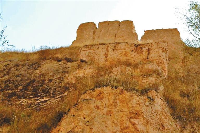 在威戎鎮(zhèn)見到的第一處遺存,是位于威戎鎮(zhèn)廣場后的一處臺(tái)地。這一處遺存,是一段殘破的老城墻,以及一座形似堡樓的殘?jiān)U驹谂_(tái)地之下,仰望斷墻,人工修筑的痕跡十分明顯,層層黃土夯筑,因?yàn)閺U棄殘破而長滿了荒草。走近堡樓,可以看見當(dāng)時(shí)修筑時(shí)搭建木椽的孔洞,還有很多手掌大小的圓形石塊。
