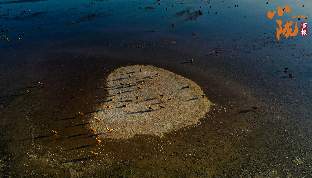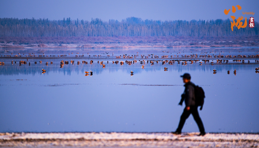陽(yáng)光照射下,鹽沼像是一片白色的海洋,湖面波光粼粼。成千上萬(wàn)只赤麻鴨,在這里停歇覓食,它們或在水中嬉戲打鬧,或在空中振翅飛翔,繪成了一幅秋日美景。