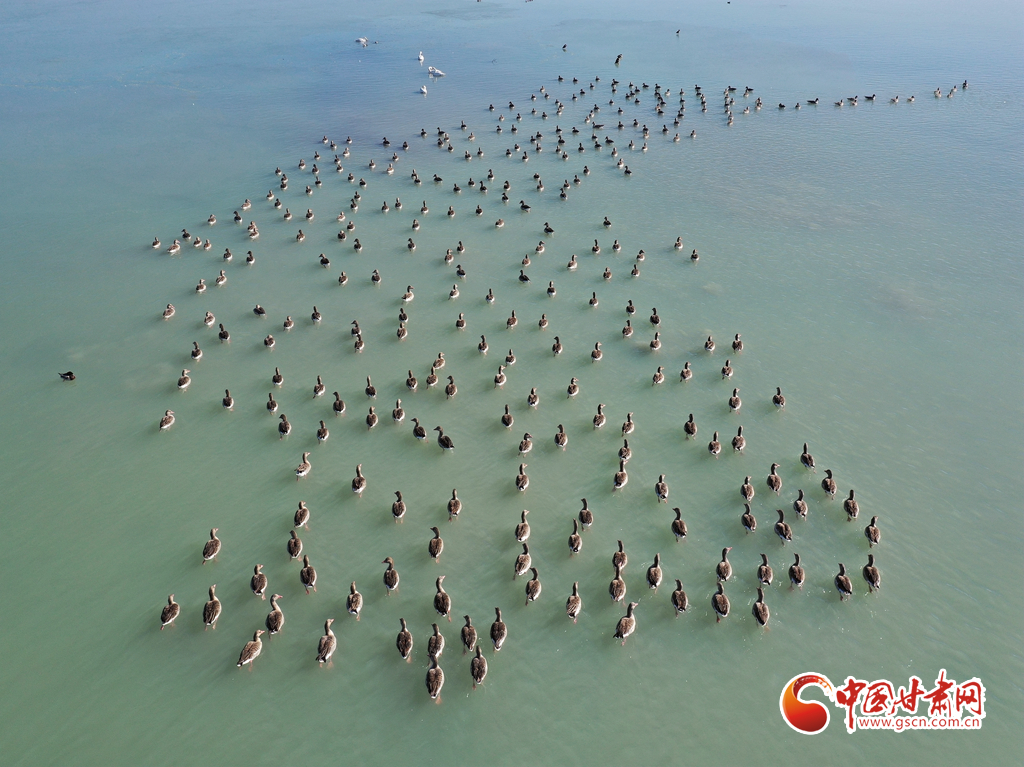 11月18日,在甘肅省張掖市臨澤縣新華農(nóng)場(chǎng)湖面上,眾多天鵝、灰雁和綠頭鴨等候鳥(niǎo)在此越冬棲息。