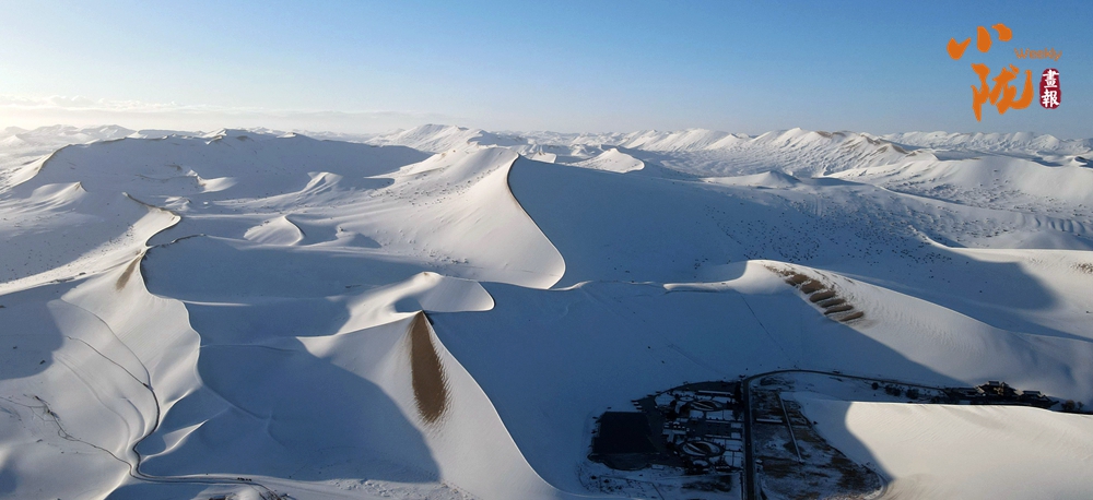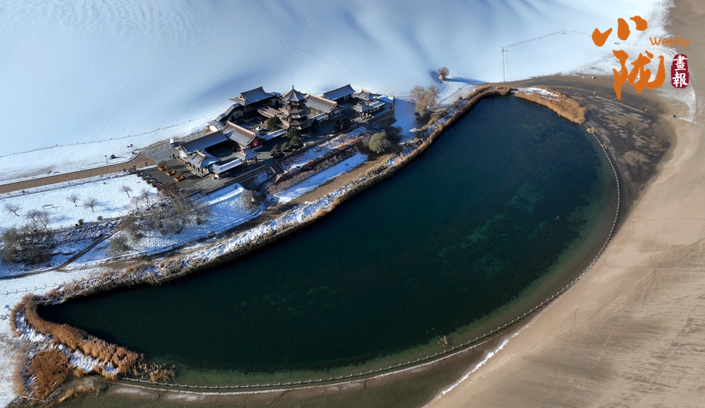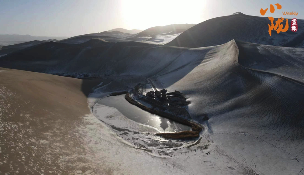 從空中俯瞰,漫漫沙漠覆蓋著白雪,月牙泉成了沙漠的眼睛,構(gòu)成另一幅美麗的沙海畫(huà)卷。