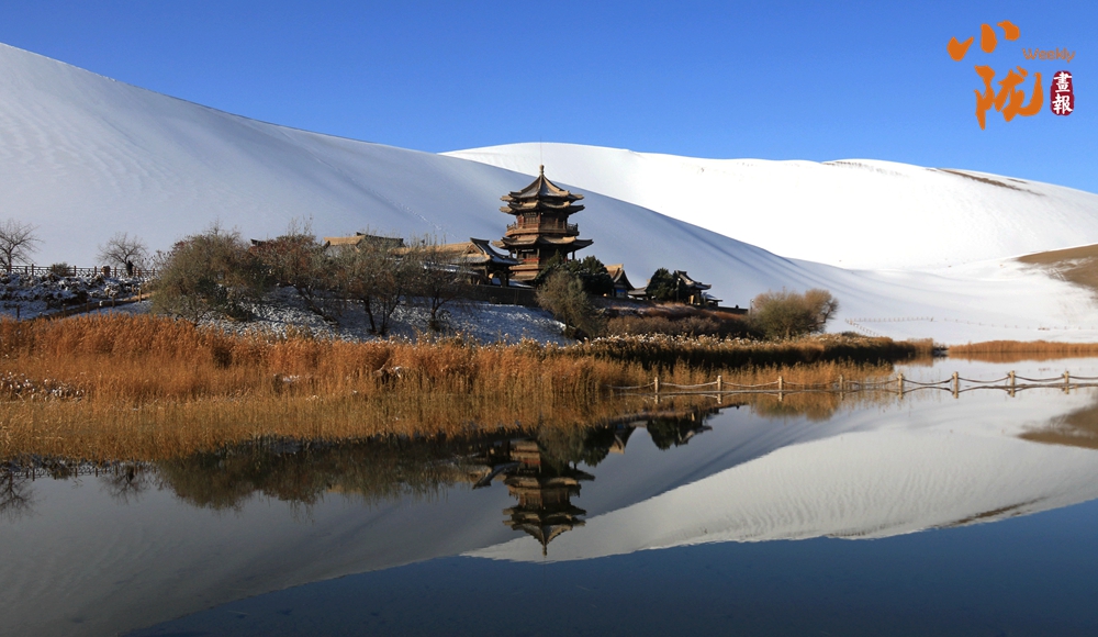 敦煌下雪之后,一半沙漠一半雪。冬日暖陽(yáng)下,月牙泉像一面鏡子,將沙漠映照得更為浪漫,讓人產(chǎn)生無(wú)限遐想。