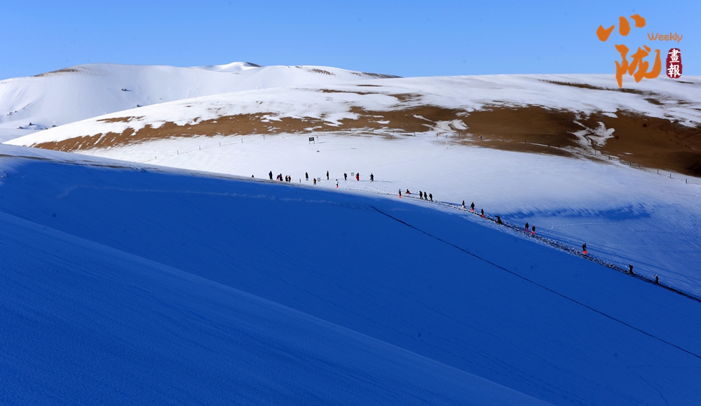 鳴沙山上,連綿不絕的沙海披上銀裝,放眼望去,如詩(shī)如畫(huà),美不勝收,吸引了不少游客騎著駱駝踏雪賞景。