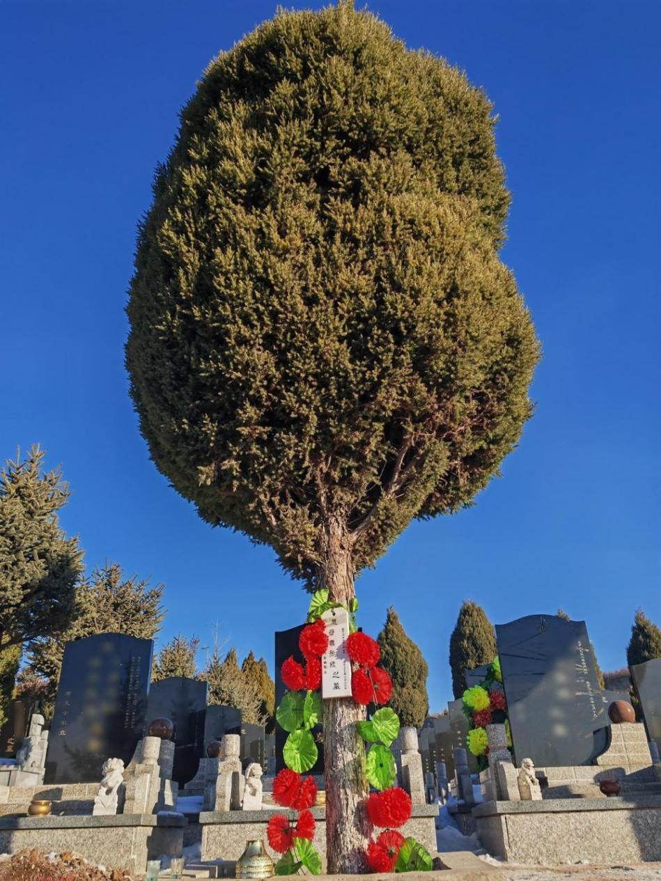 遼寧阜新市公墓的東南角,一棵挺拔翠綠的柏樹(shù)樹(shù)干上,掛有一個(gè)長(zhǎng)30厘米、寬10厘米的小木牌,上寫(xiě)有“魏彤欣之墓”,一束花環(huán)環(huán)繞周圍,在陽(yáng)光的照耀下格外絢麗。