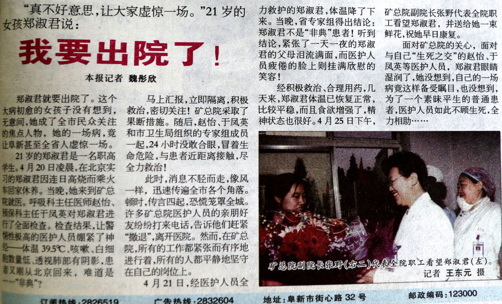 作為部門領(lǐng)導(dǎo),她依然表現(xiàn)出色,2003年“非典”期間,她擔(dān)任阜新晚報(bào)要聞部主任,她提出“最危險(xiǎn)的地方,我先上!”4月20日,有一個(gè)學(xué)生從北京回來(lái),因?yàn)楦邿煌吮粦岩蔀楦腥?ldquo;非典”,一時(shí)間謠言四起,恐慌籠罩全城,魏彤欣一個(gè)人冒著風(fēng)險(xiǎn)深入醫(yī)院跟蹤采訪,在得知確診不是“非典”后,第一時(shí)間發(fā)出了報(bào)道《我要出院了》,及時(shí)消除了公眾恐慌情緒。她帶領(lǐng)記者深入發(fā)熱門診、城市出入口的檢查站和醫(yī)護(hù)人員之間,掌握了大量的一手材料,共采寫(xiě)了70余篇稿件,她本人被評(píng)為“遼寧省抗擊非典新聞宣傳先進(jìn)個(gè)人”,她所在的部門被評(píng)為“遼寧省抗擊非典新聞宣傳先進(jìn)集體”。