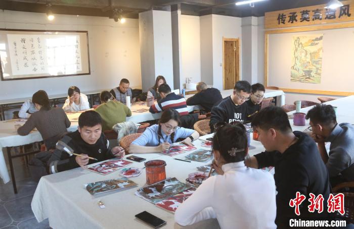 1月11日,來自云南的學(xué)員在甘肅敦煌小鎮(zhèn)鳴沙書院研學(xué)課堂學(xué)習(xí)臨摹敦煌壁畫。張曉亮 攝