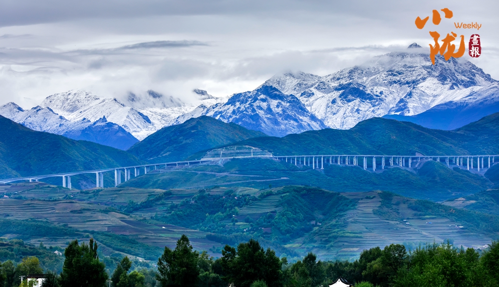 層巒疊嶂的雪峰和蔥郁的山坡、綠樹(shù)形成鮮明對(duì)比,成為一道靚麗的風(fēng)景線。駐足遠(yuǎn)觀,滿眼都是大自然的溫柔與浪漫。