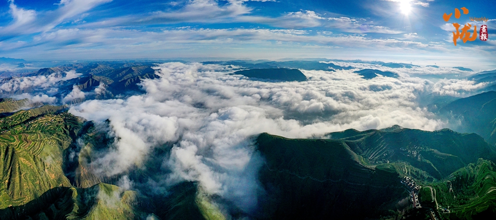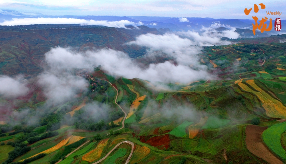在旅游大通道積石山段遠(yuǎn)眺,云霧穿山飄過(guò),遠(yuǎn)處的村莊和梯田時(shí)隱時(shí)現(xiàn),遠(yuǎn)山近嶺,草樹(shù)煙村......置身其中,仿佛步入了人間仙境。