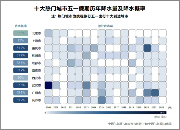 我們選取了攜程旅行公布的五一假期十大熱門旅游目的地,來看看自2008年以來,熱門出行城市下雨的概率有多少?降水量大不大?
