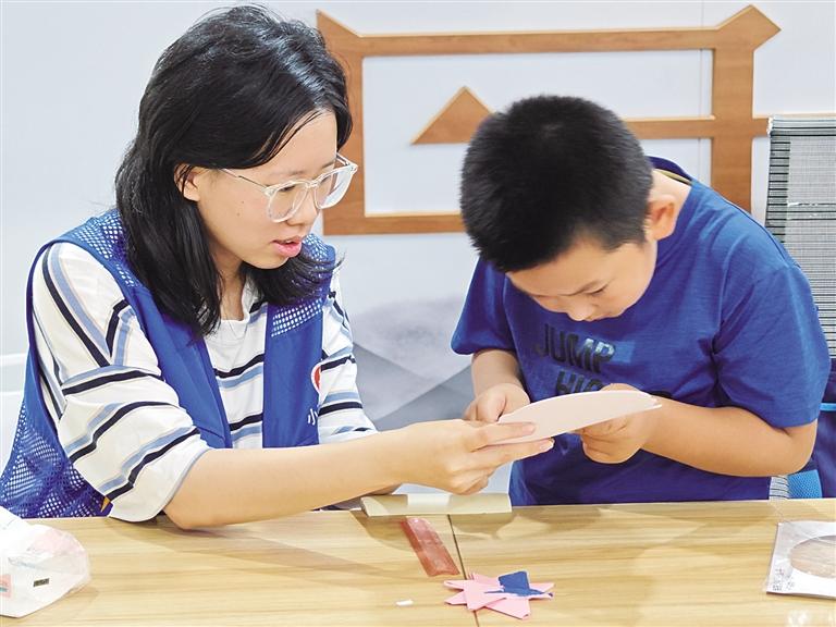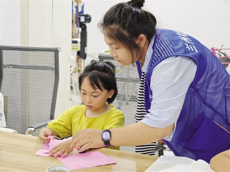 這個夏天,來自天津工藝美術學院的大二學生張如晉玄又一次穿上藍馬甲,成為了蘭州小草愛心社會工作服務中心的一名社工。在鹽場路街道的暑期愛心托管班,每天早上8點半,她便準時到達工作地點,等待著家長將一只只“小神獸”送來托管。從早上的輔導暑假作業(yè),中午看著孩子們用餐、午睡,再到下午主題豐富的興趣小課堂,張如晉玄和同事們不僅解除家長暑期的后顧之憂,也讓孩子們度過一個紛紛多彩的假期。