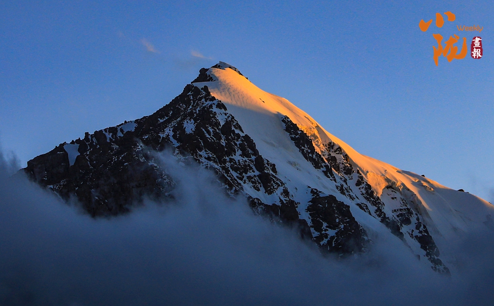 雪山山巒間,云霧回旋飄動(dòng),彌漫舒展,如海浪起伏、波濤滾滾一般,與湛藍(lán)天空相互映襯,壯美如畫(huà)。