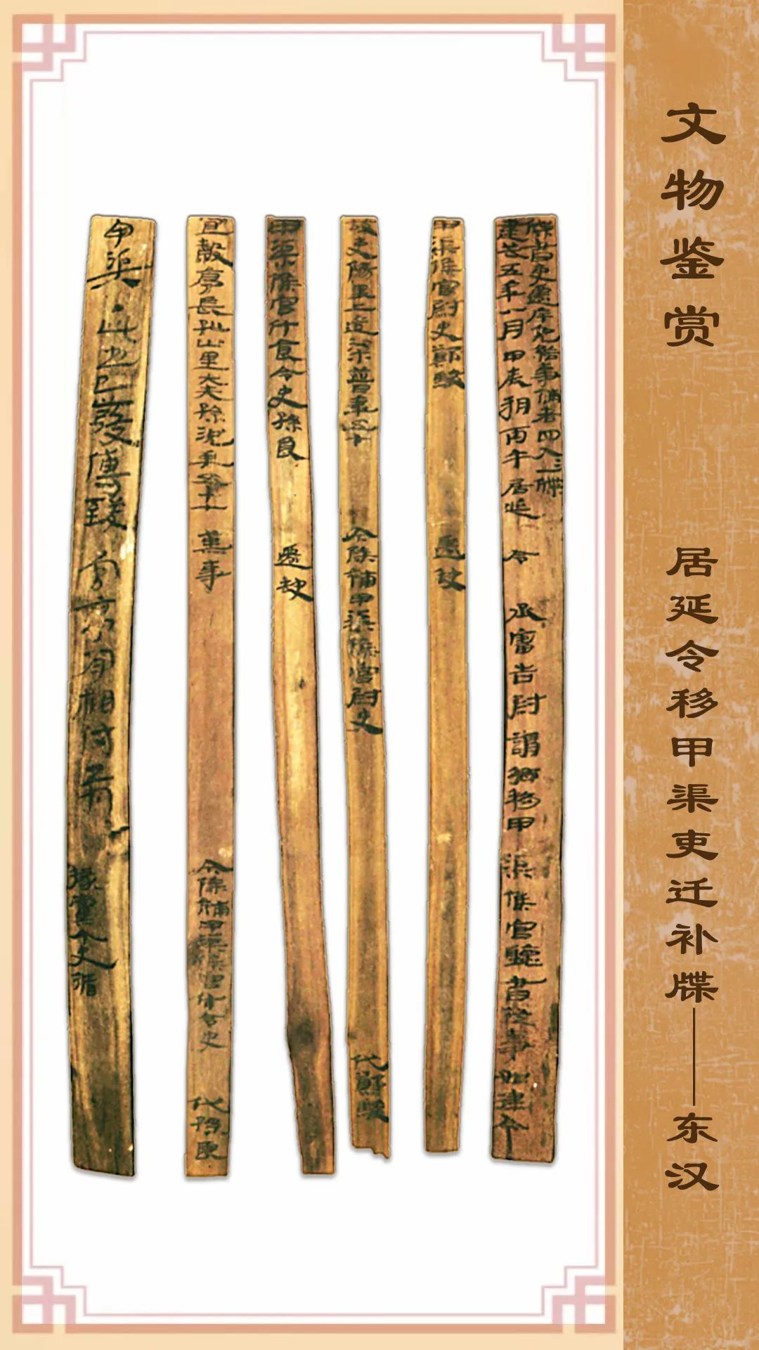 此簡牘1974年出土于甲渠候官遺址第22號房址。簡冊一共5枚,是一份東漢建武五年八月甲辰(公元29年8月31日)由居延縣令簽發(fā)的一份官吏任免草擬文件。簡牘均長22.7厘米,其中第1枚寬1.6厘米,其余4枚寬1厘米,存字141字。