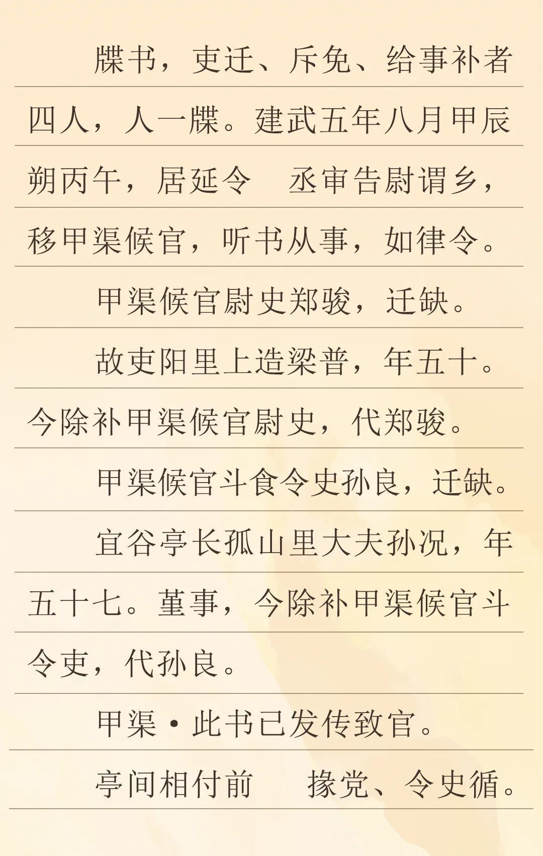 這是一份距今1995年的地方官員任命書。當時是東漢建武五年八月,在漢代張掖郡居延邊塞的甲渠候官進行了人事調(diào)整,對官吏進行了任免。一個是甲渠候官尉史鄭駿升遷,由五十歲的梁普補缺;另一個是甲渠候官斗食令史孫良升遷,由五十七歲的原宜谷亭長孫況代任,其中提到孫況做人低調(diào)、行事嚴謹(即“謹事”)。這次人事調(diào)整是由居延縣負責。